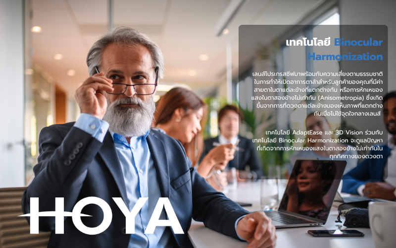 HOYA เป็นแบรนด์ที่พัฒนาเลนส์โปรเกรสซีฟโดยยึดการใช้งานจริงเป็นหลัก แบ่งเลนส์ตามไลฟ์สไตล์ เช่น งานออฟฟิศ งานที่ต้องเคลื่อนไหว หรือการใช้ดิจิทัลเป็นหลัก นอกจากนี้ยังเน้นเรื่องการลดความล้าของดวงตา จากการใช้งานหน้าจอ ซึ่งตอบโจทย์คนยุคนี้มาก หมอมักแนะนำให้กับคนทำงานหน้าจอเยอะ ใช้สายตาหนัก และต้องการเลนส์ที่ปรับตัวง่าย