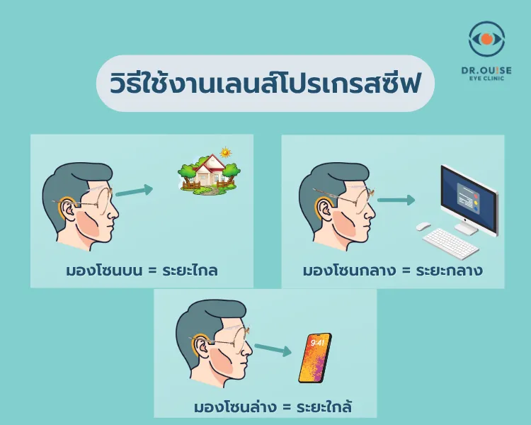 อย่างที่บอกไปในตอนแรก ว่าเลนส์โปรเกรสซีฟ จะโดดเด่นตรงการ ไล่กำลังเลนส์จากบนลงล่างอย่างต่อเนื่อง ในเลนส์เดียว ทำให้ภาพที่ได้ไม่กระโดด เป็นธรรมชาติ ทั้งยังช่วยให้บุคลิกภาพของผู้สวมใส่ดูไม่แก่เกินวัย คล้าย ๆ กับการใช้งานเลนส์ชั้นเดียว ซึ่งหลักการใช้งานจะใช้วิธีขยับศีรษะ เพื่อมองผ่านโซนต่าง ๆ แทนการเหลือบตา เพื่อป้องกันอาการวิงเวียนศีรษะ ดังนี้