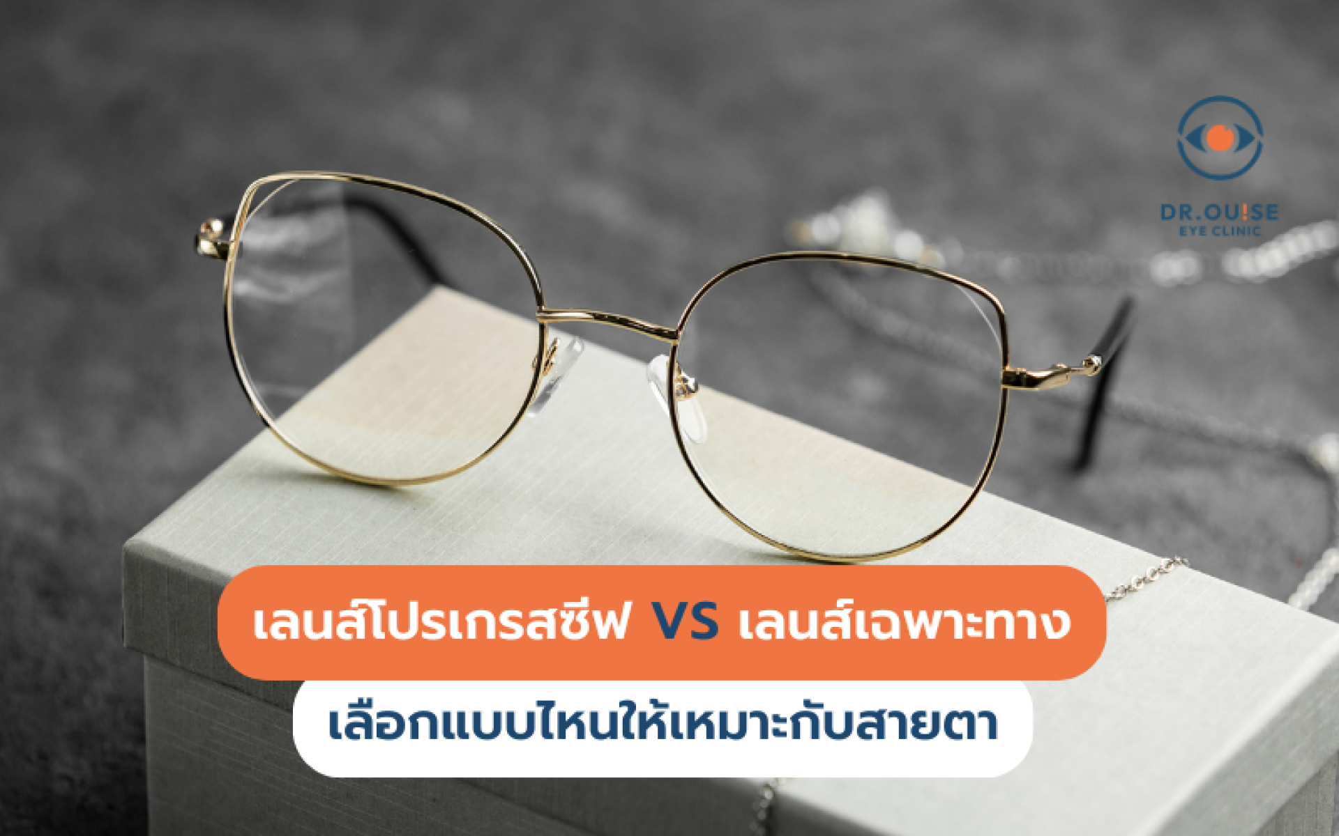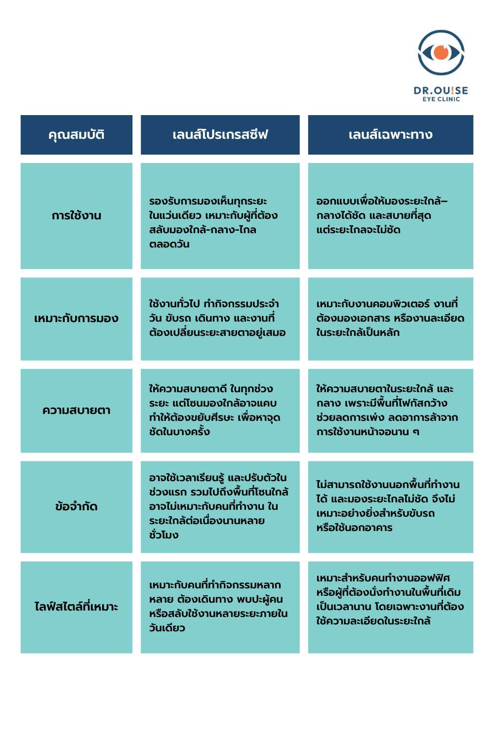 หมอขอสรุปส่งท้ายสั้นๆ เลยนะคะ เลนส์โปรเกรสซีฟ เหมาะสำหรับคนที่ต้องการแว่นเดียวใช้งานได้ทุกระยะ ทั้งใกล้กลางไกล สะดวกในชีวิตประจำวัน แต่โซนมองใกล้อาจแคบและต้องปรับตัวเล็กน้อย ในขณะที่เลนส์เฉพาะทาง จะให้ความสบายสูงสุดเมื่อทำงานระยะใกล้กลาง เช่น คอมพิวเตอร์หรือเอกสาร เพราะมีพื้นที่โฟกัสกว้างและลื่นตา แต่ไม่สามารถใช้มองไกลหรือใช้นอกงานได้ดีนัก ดังนั้น การเลือกเลนส์ควรอิงจากงานที่ทำในแต่ละวันเป็นหลัก เพื่อให้ได้ทั้งความชัดเจน ความสบายตา และคุณภาพชีวิตที่ดีที่สุดค่ะ