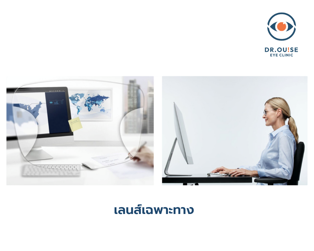 เลนส์เฉพาะทางที่หมอหมายถึงในบทความนี้ คือ เลนส์สำหรับการทำงานเฉพาะด้าน เช่น เลนส์สำหรับทำงานคอมพิวเตอร์ (Office / Workspace / Computer Lens) เป็นเลนส์ที่ถูกออกแบบ เพื่อมองใกล้และมองกลางเป็นหลัก (ตั้งแต่ช่วงประมาณ 40 ซม. ถึง 3 เมตร) ผู้สวมใส่สามารถปรับสายตาหรือปรับตัวเพื่อใช้งานได้ง่ายมาก เพราะโครงสร้างเลนส์ออกแบบโดยการตัดโซนมองไกลออก เพื่อเพิ่มพื้นที่อ่านหนังสือ หรือมองหน้าจอคอมพิวเตอร์ที่กว้างขึ้น ทำให้ภาพมีความบิดเบือนด้านข้างน้อยกว่า เมื่อเทียบกับเลนส์โปรเกรสซีฟ หรือเลนส์หลายระยะ ที่ออกแบบมาสำหรับคนสายตายาว