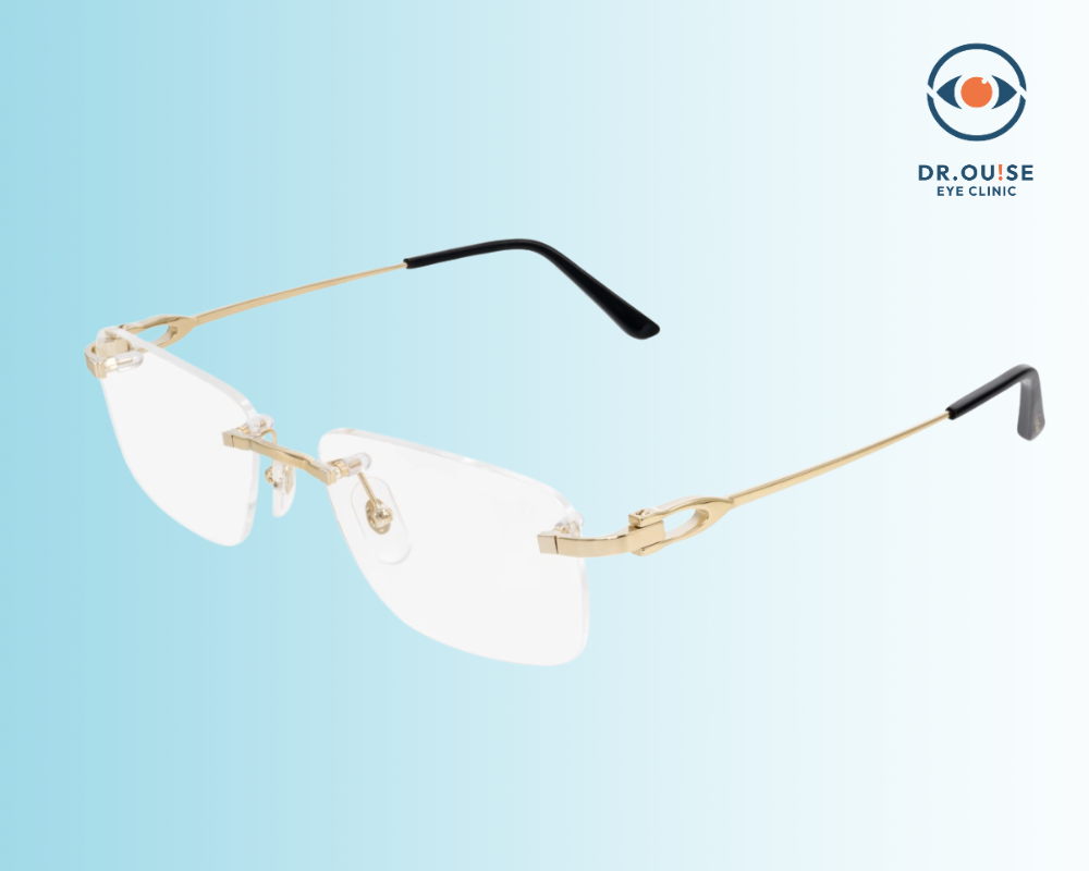 แว่นทรงไร้กรอบหรือกรอบเจาะ ตัวเลนส์ต้องมีความเหนียวเป็นพิเศษเพื่อยึดกับขาแว่นได้อย่างปลอดภัย ไม่แตกหักง่าย เหมาะกับผู้ที่ต้องการความเป็นทางการ มีค่าสายตาสูง และต้องการกรอบแว่นตาที่มีน้ำหนักเบา โดยดีไซน์มักเน้นไปที่ขาแว่น เช่น การสลักลายลวดลาย ประดับเพชร หรือใช้วัสดุพิเศษอย่างไม้หรือเขาสัตว์ ทำให้หรูหราไม่แพ้ทรงอื่น และยังปรับรูปทรงเลนส์ได้ตามต้องการเพราะไม่มีกรอบบังคับ