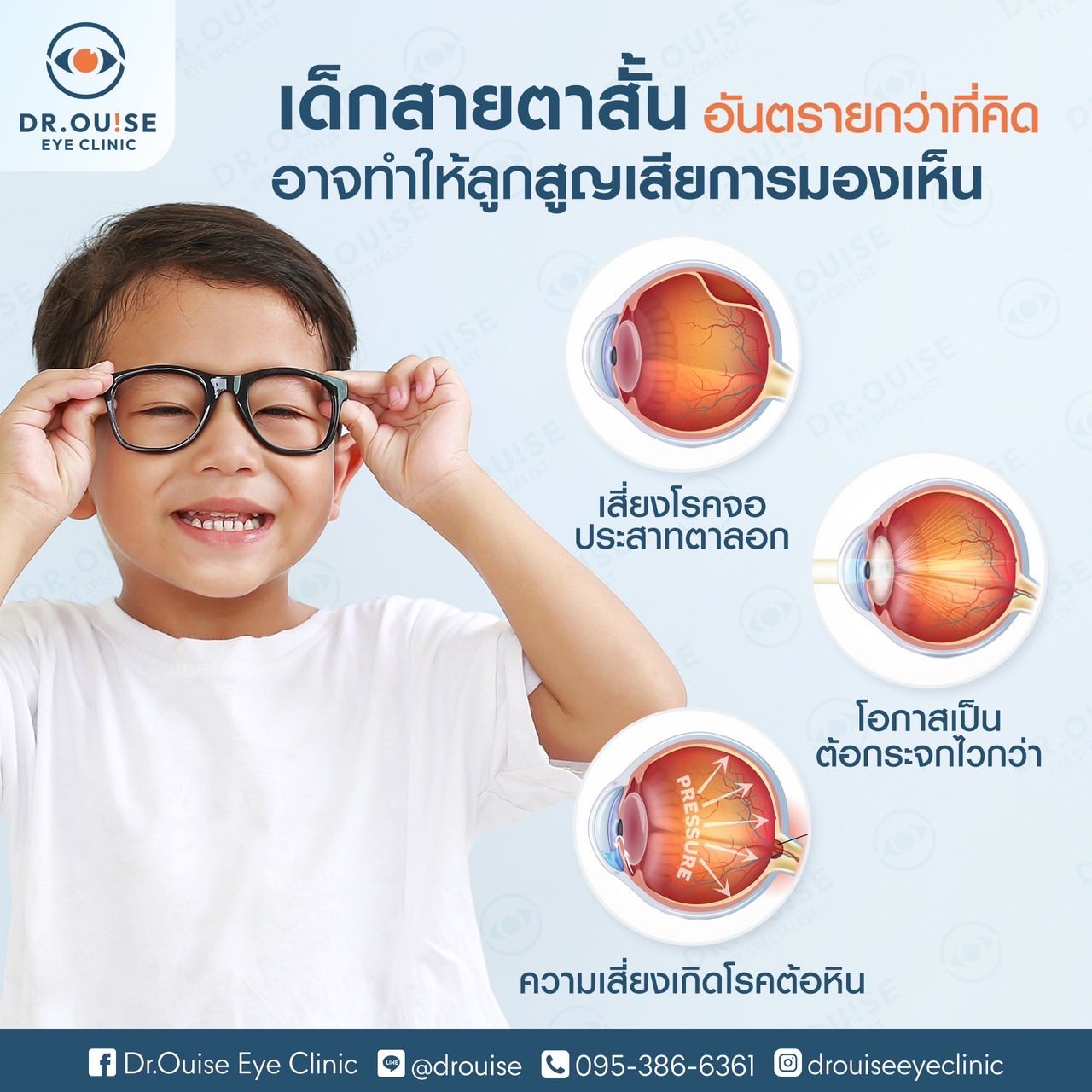 - เมื่อค่าสายตาสั้นเพิ่มขึ้นมาก อาจมีความเสี่ยงต่อภาวะแทรกซ้อนทางจักษุเช่น ต้อหิน ต้อกระจก หรือจอประสาทตาหลุดลอกในอนาคต