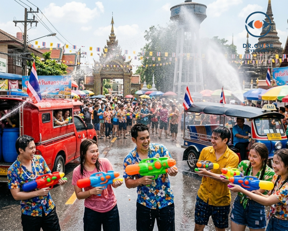 ต้องทำความเข้าใจสักหน่อยค่ะ ว่าน้ำที่ใช้เล่นสงกรานต์หลายแห่ง อาจไม่ใช่น้ำสะอาด 100% บางแหล่งอาจมีเชื้อโรค แบคทีเรีย หรือสิ่งปนเปื้อนที่มองไม่เห็น หากน้ำเข้าสู่ดวงตาโดยตรง อาจเพิ่มความเสี่ยงต่อการติดเชื้อ เช่น ตาแดง หรือกระจกตาอักเสบ โดยเฉพาะคนใส่คอนแทคเลนส์จะเสี่ยงมากขึ้น เพราะเชื้อโรคสามารถเกาะที่เลนส์ได้ง่าย
